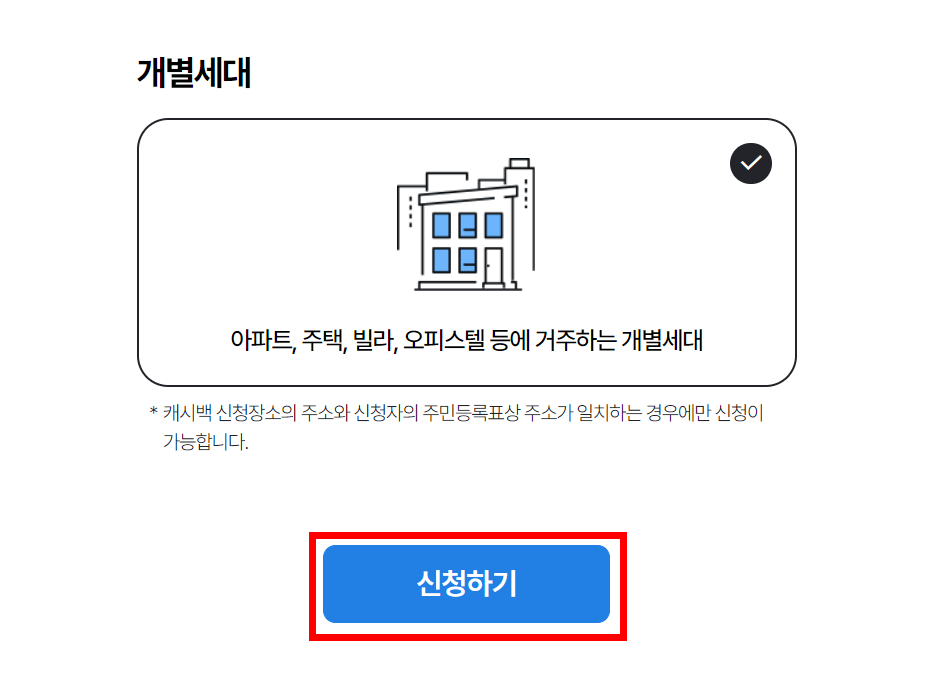 캐시백 산정기간 중 신청자의 주소지가 변경된 경우 캐시백 지급이 제외되며, 캐시백 재신청을 위해서는 변경된 주소지 기준으로 다시 신청해주셔야 합니다.